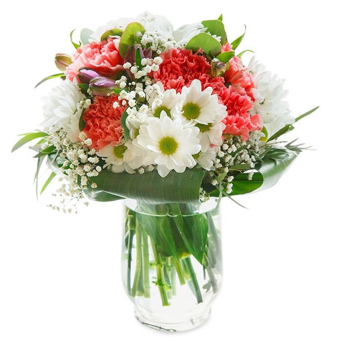 Our Charming White & Pink Bouquet is perfect for expressing love and admiration. This exquisite arrangement features snow-white chrysanthemums, delicate gypsophila, soft light pink carnations, and vibrant aspidistra leaves, creating a visually stunning display.